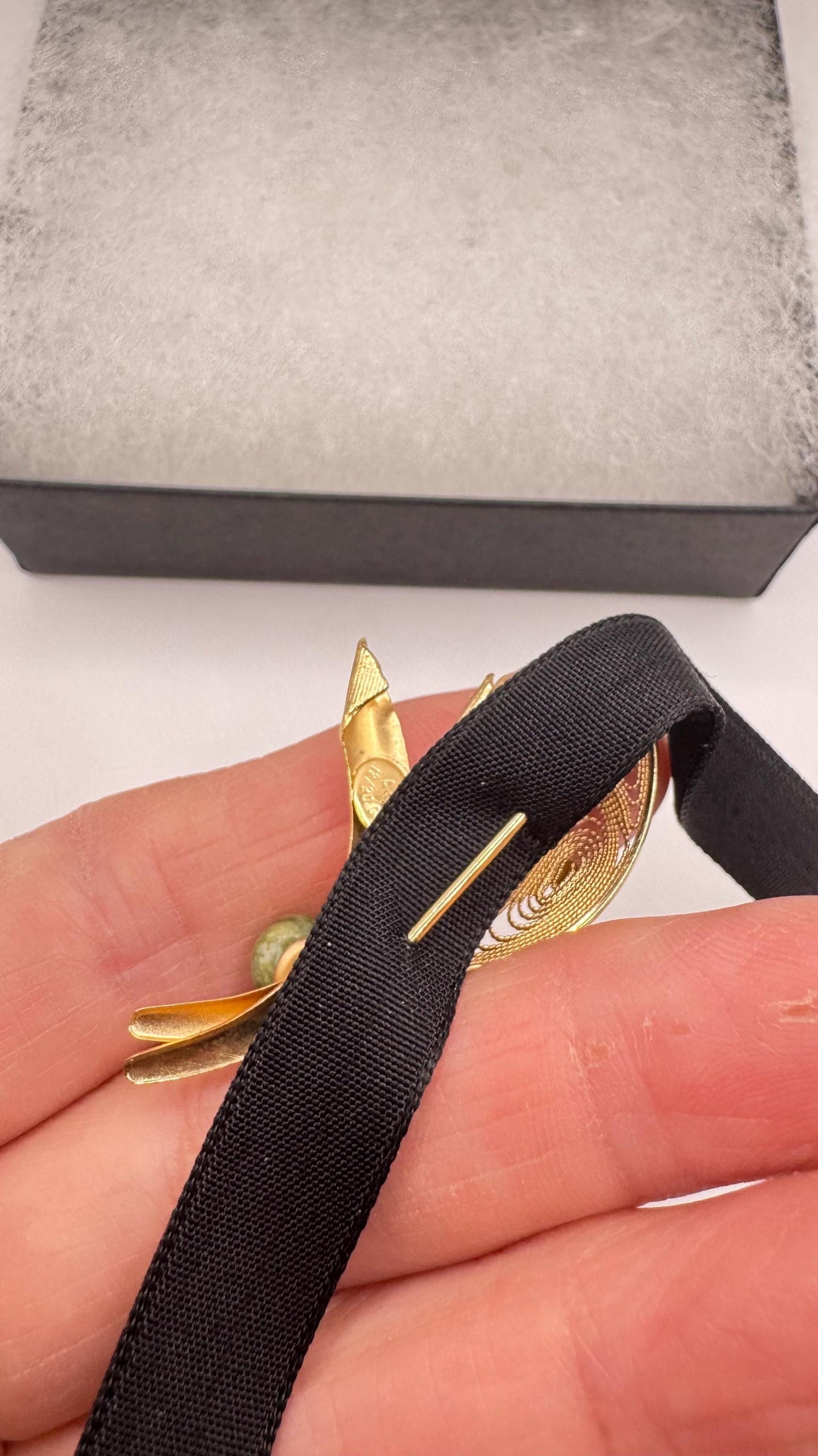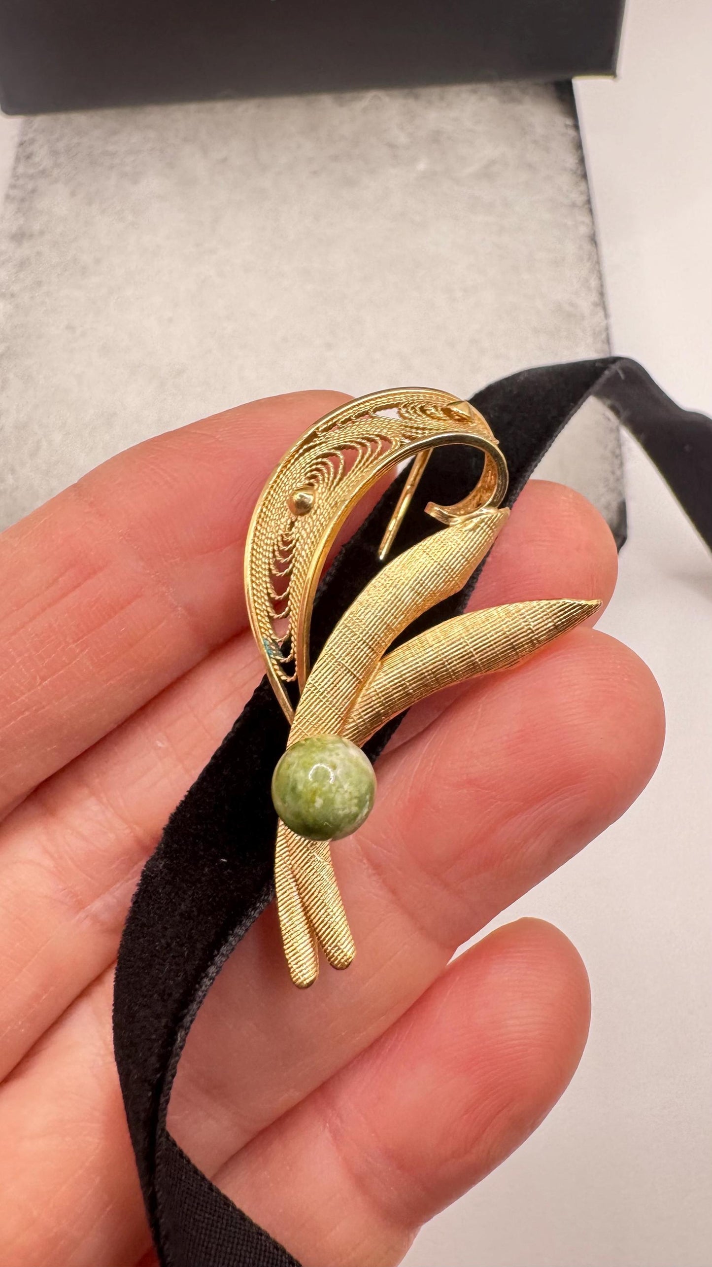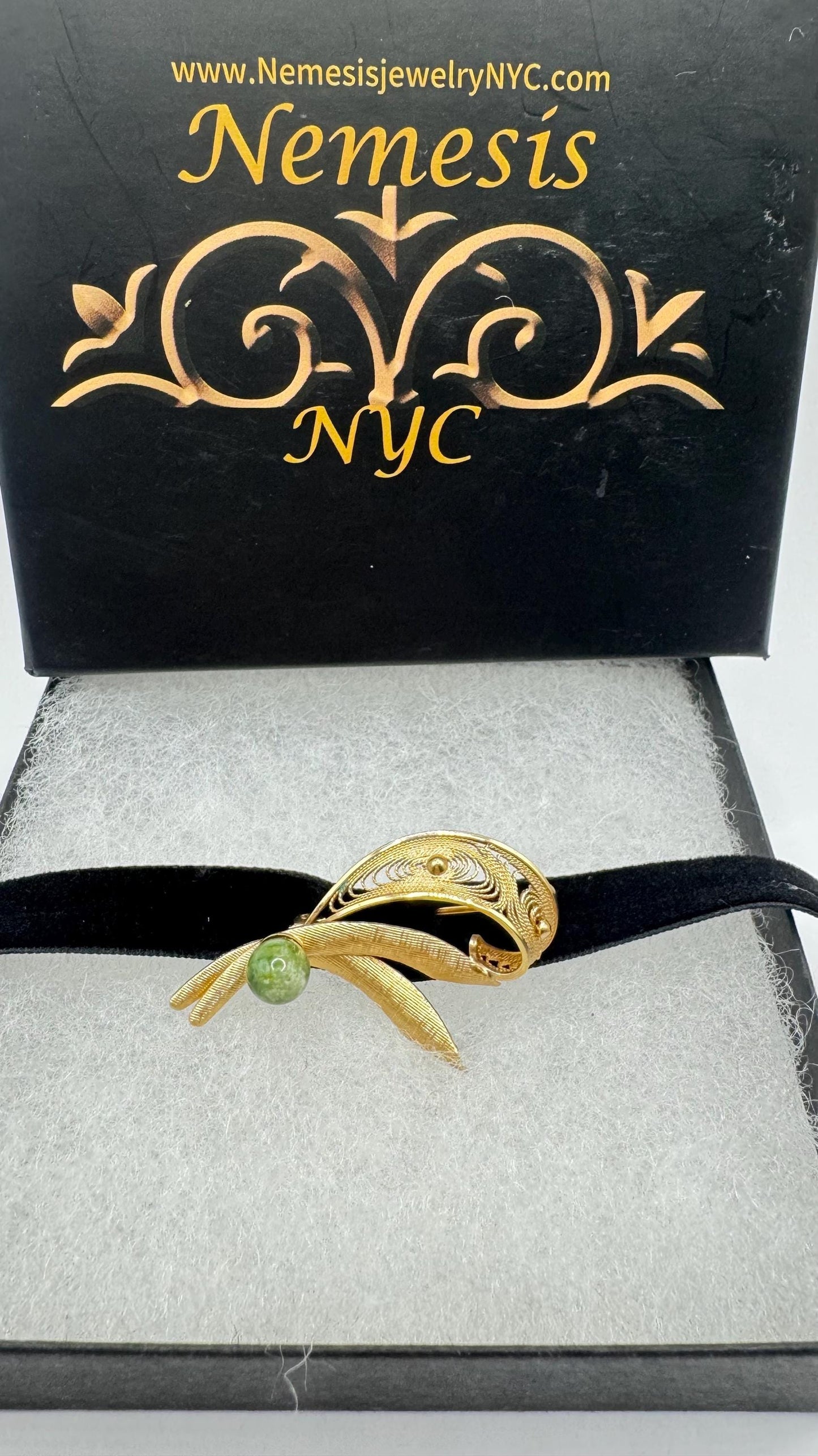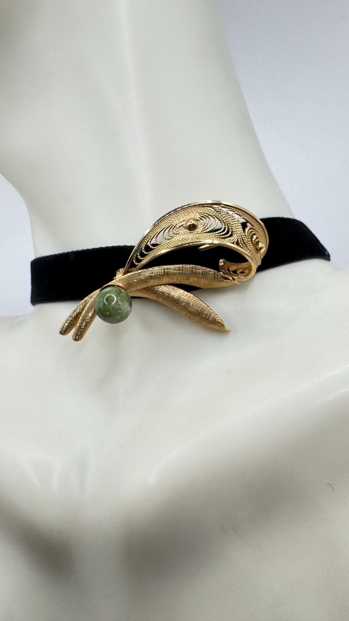 Vintage Green Jade Yellow Gold Filled Brooch Pin | black velvet choker
