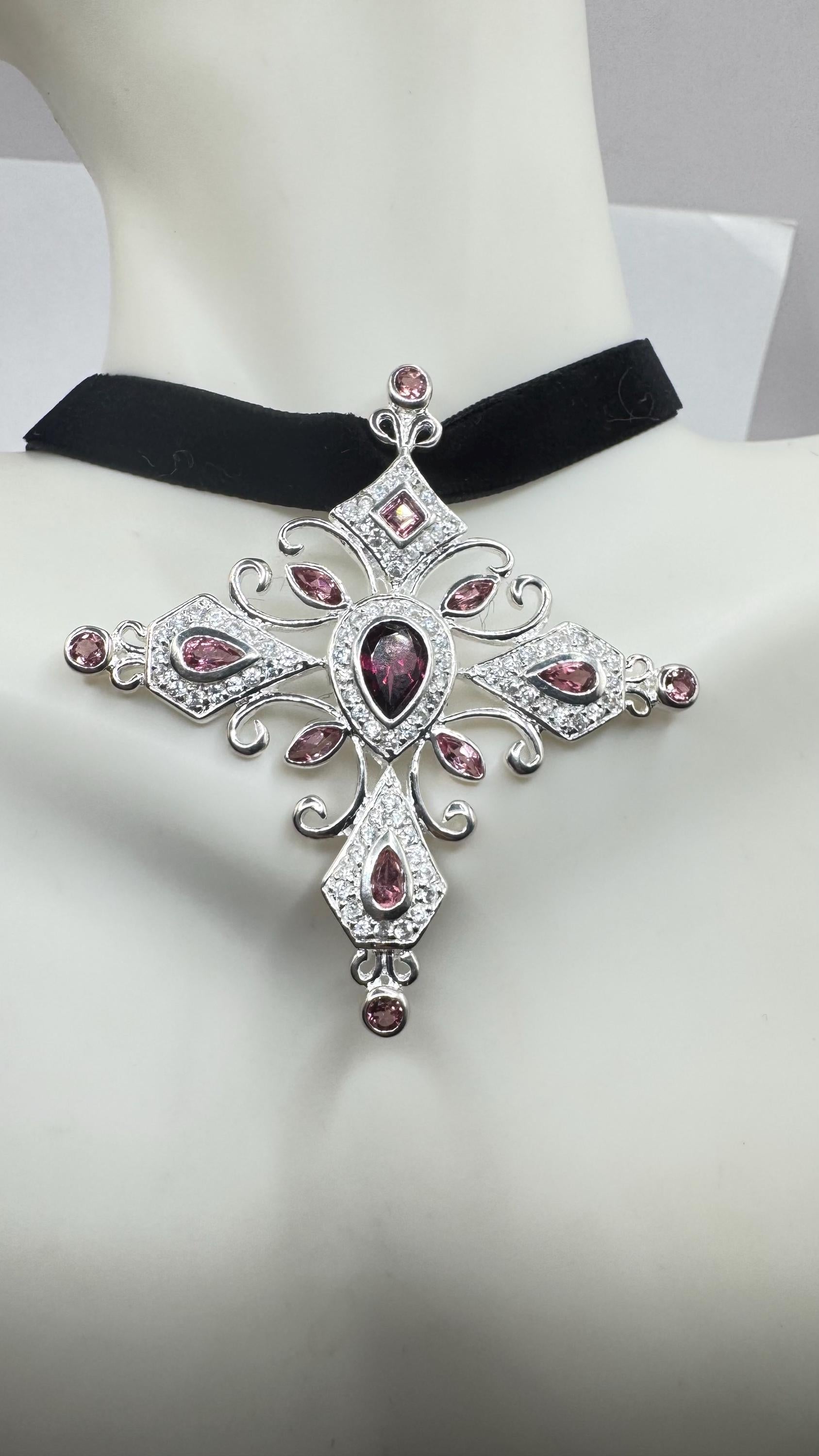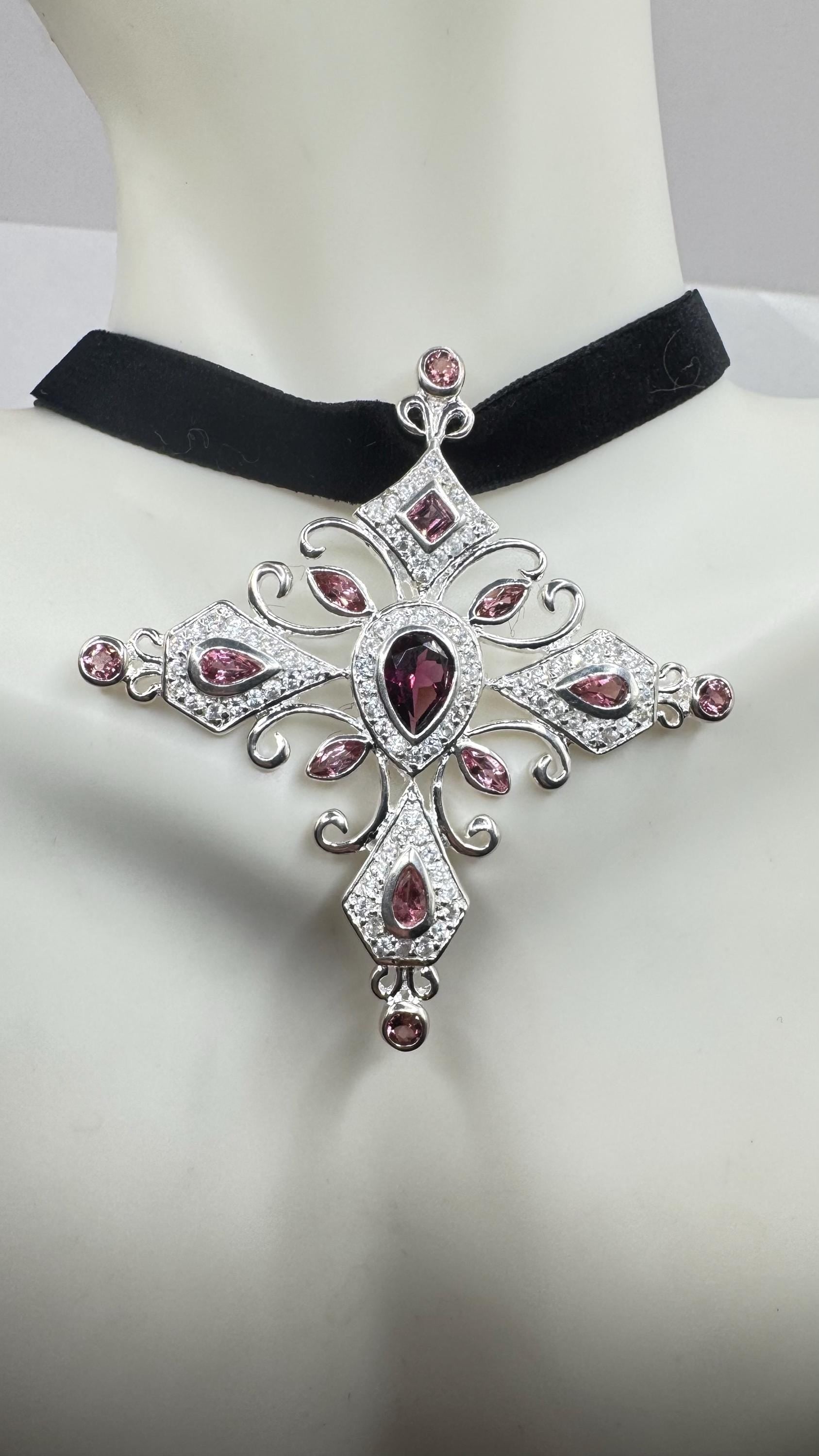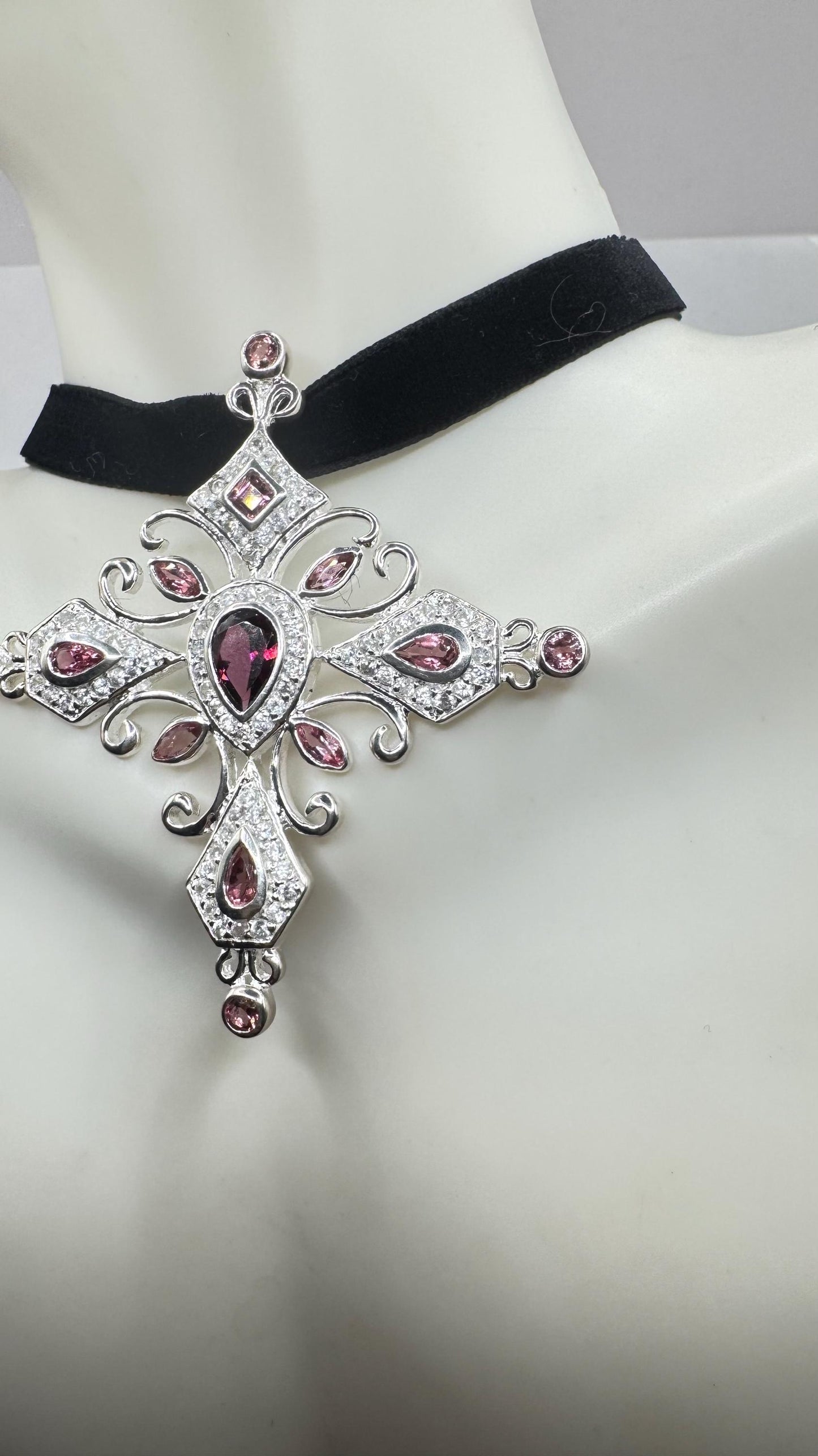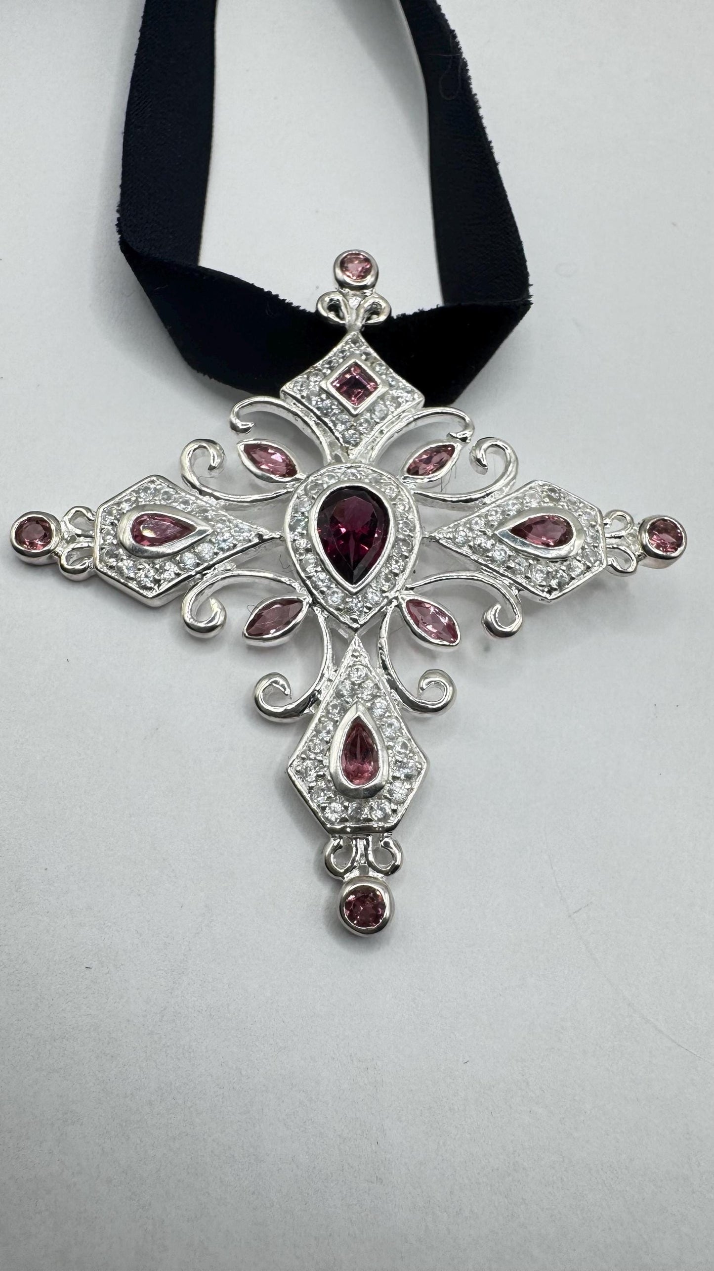 Vintage Red Cross Choker Tourmaline 925 Sterling Silver Cross Pendant