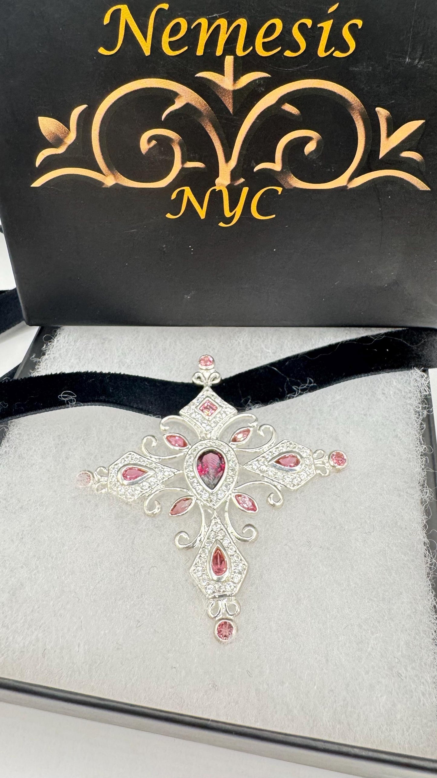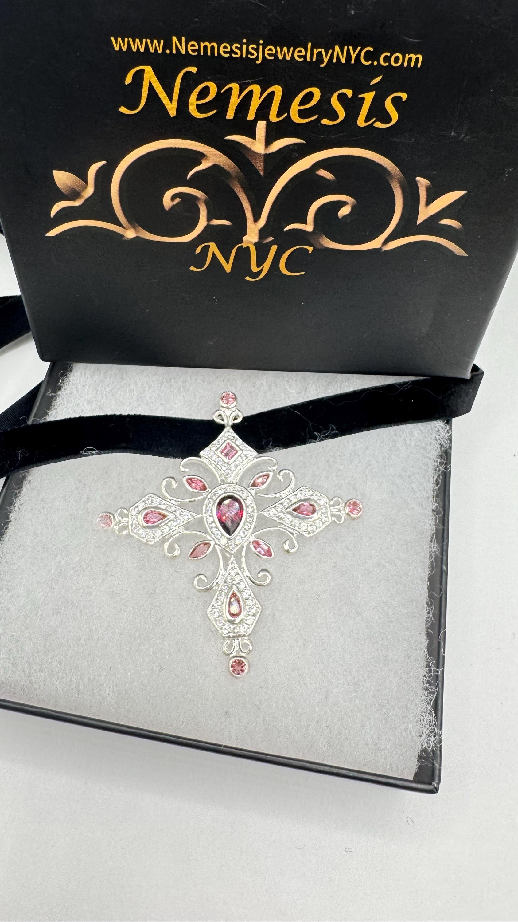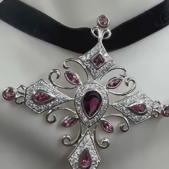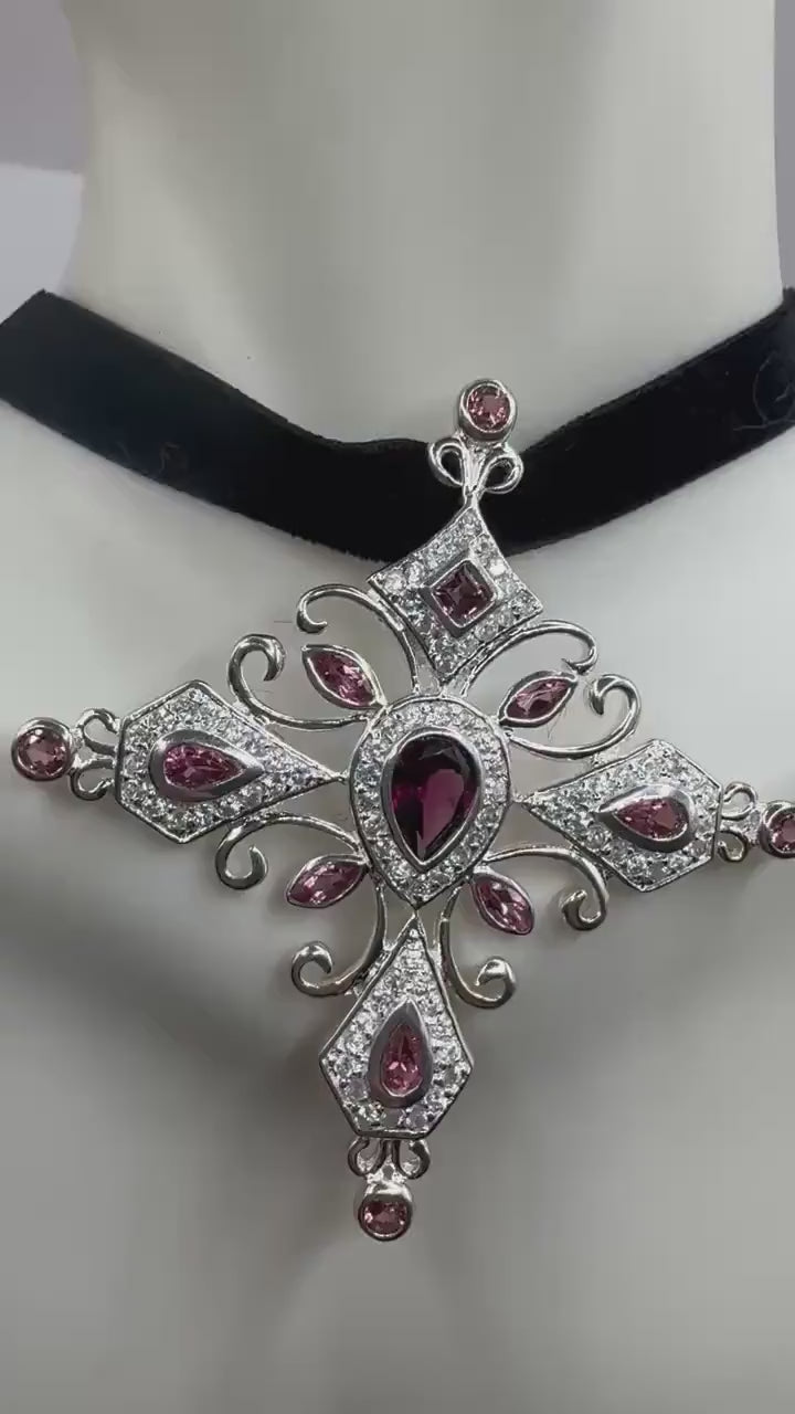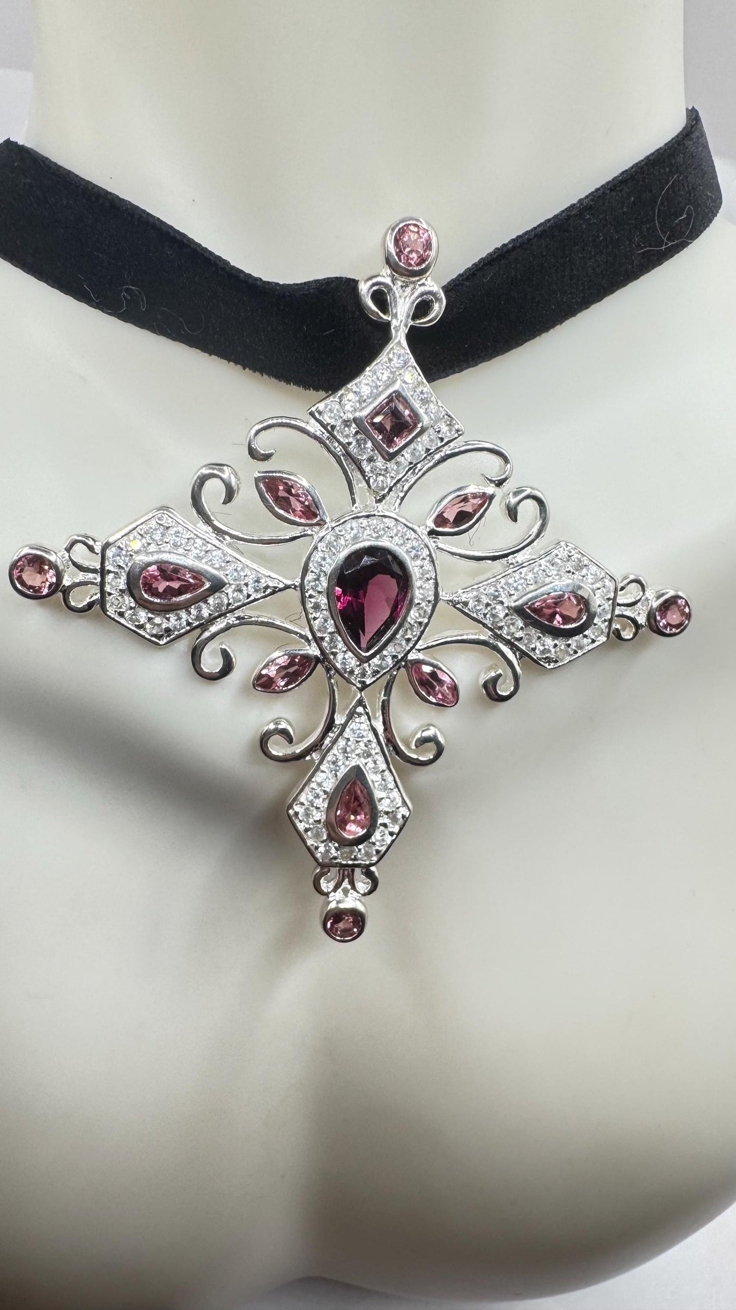 Vintage Red Cross Choker Tourmaline 925 Sterling Silver Cross Pendant