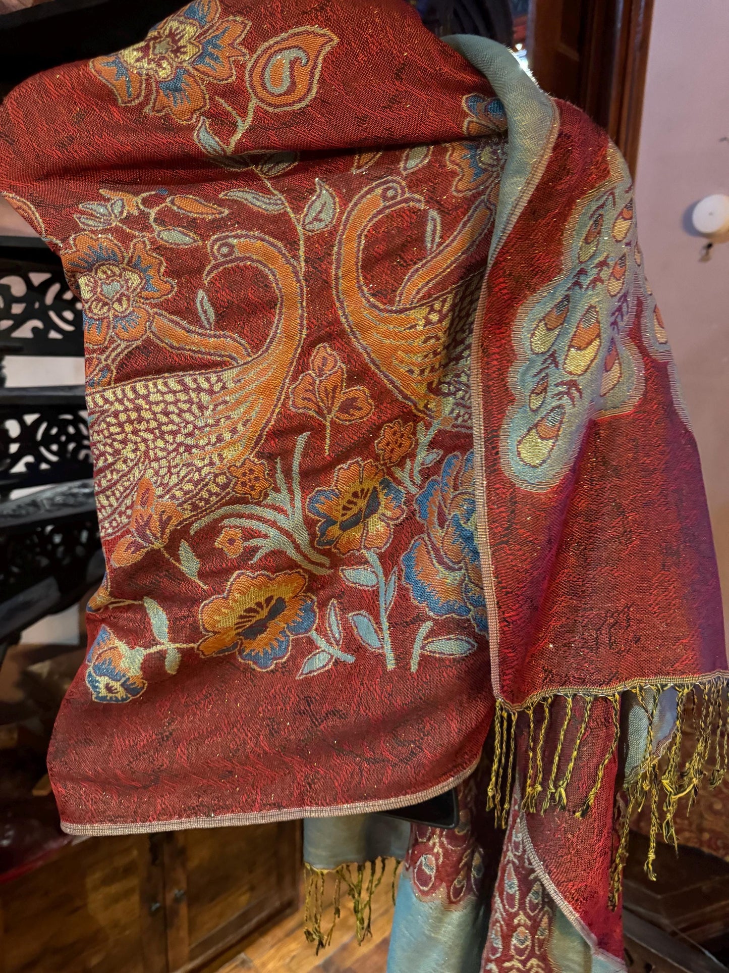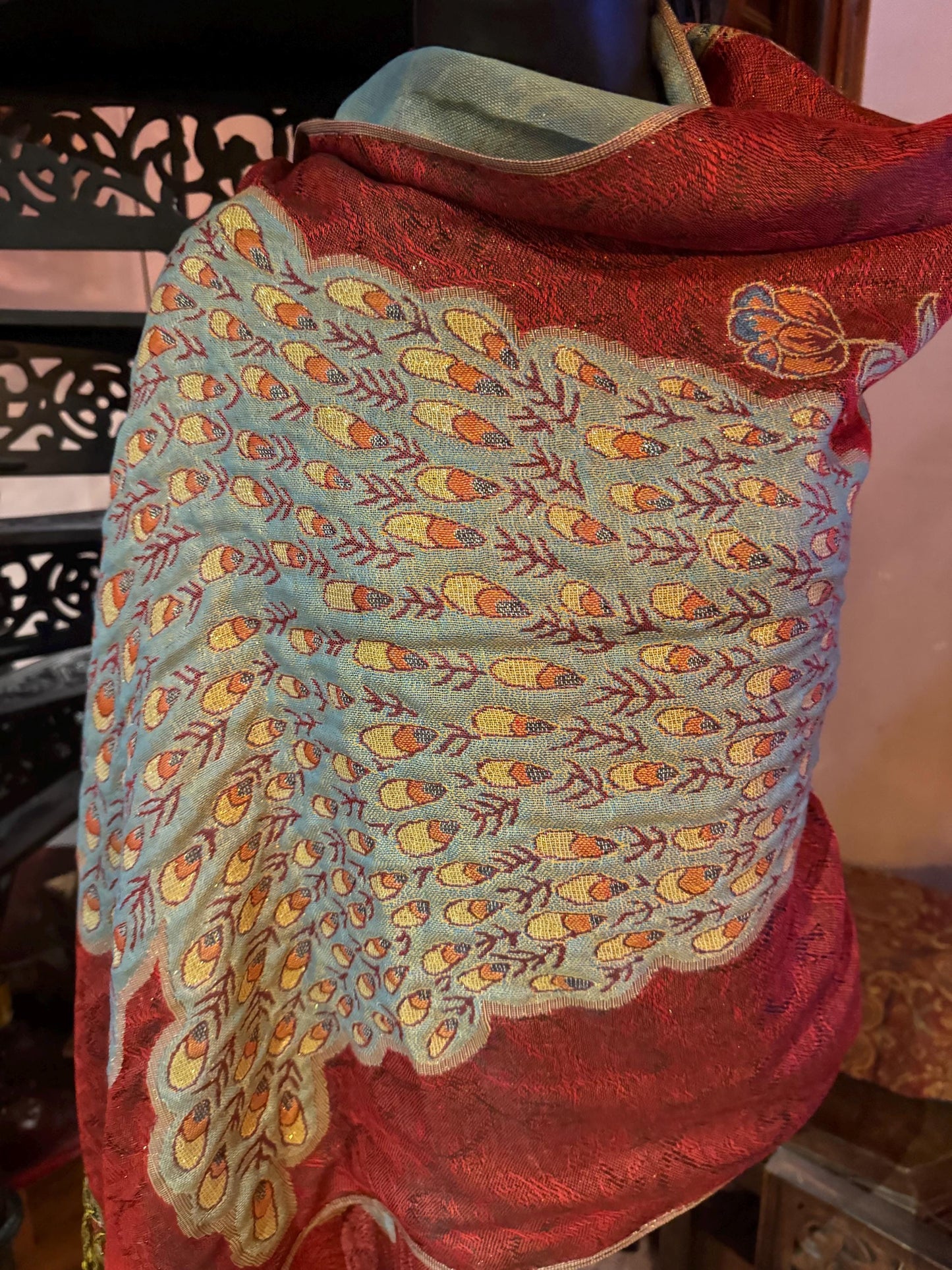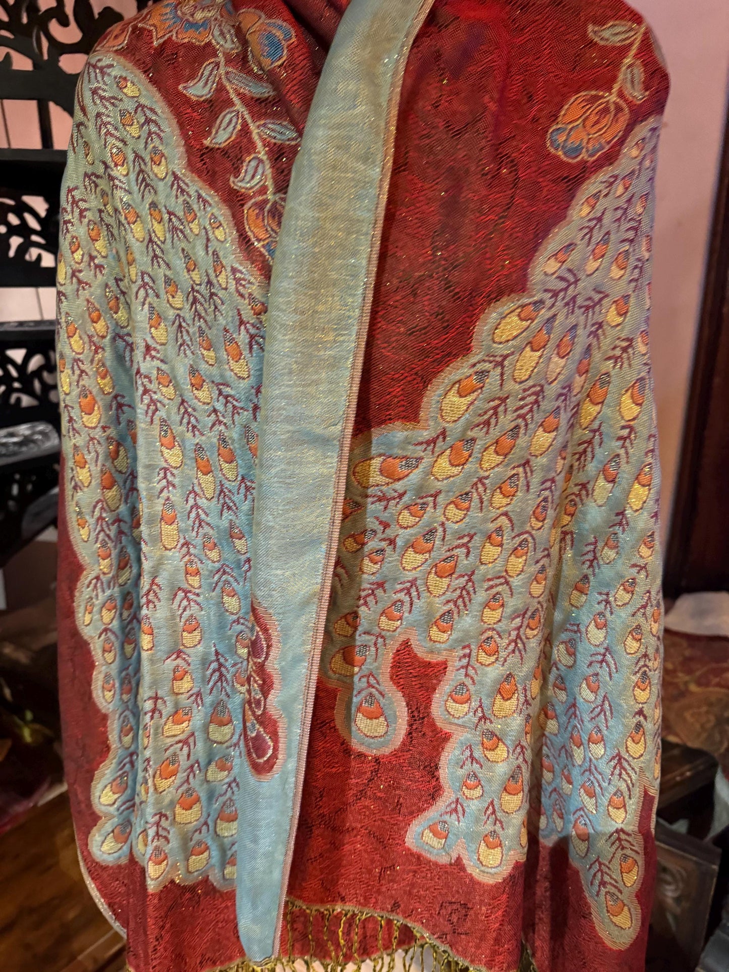 Vintage Red Peacock Feather Brocade Pashmina Scarf Wrap Shawl