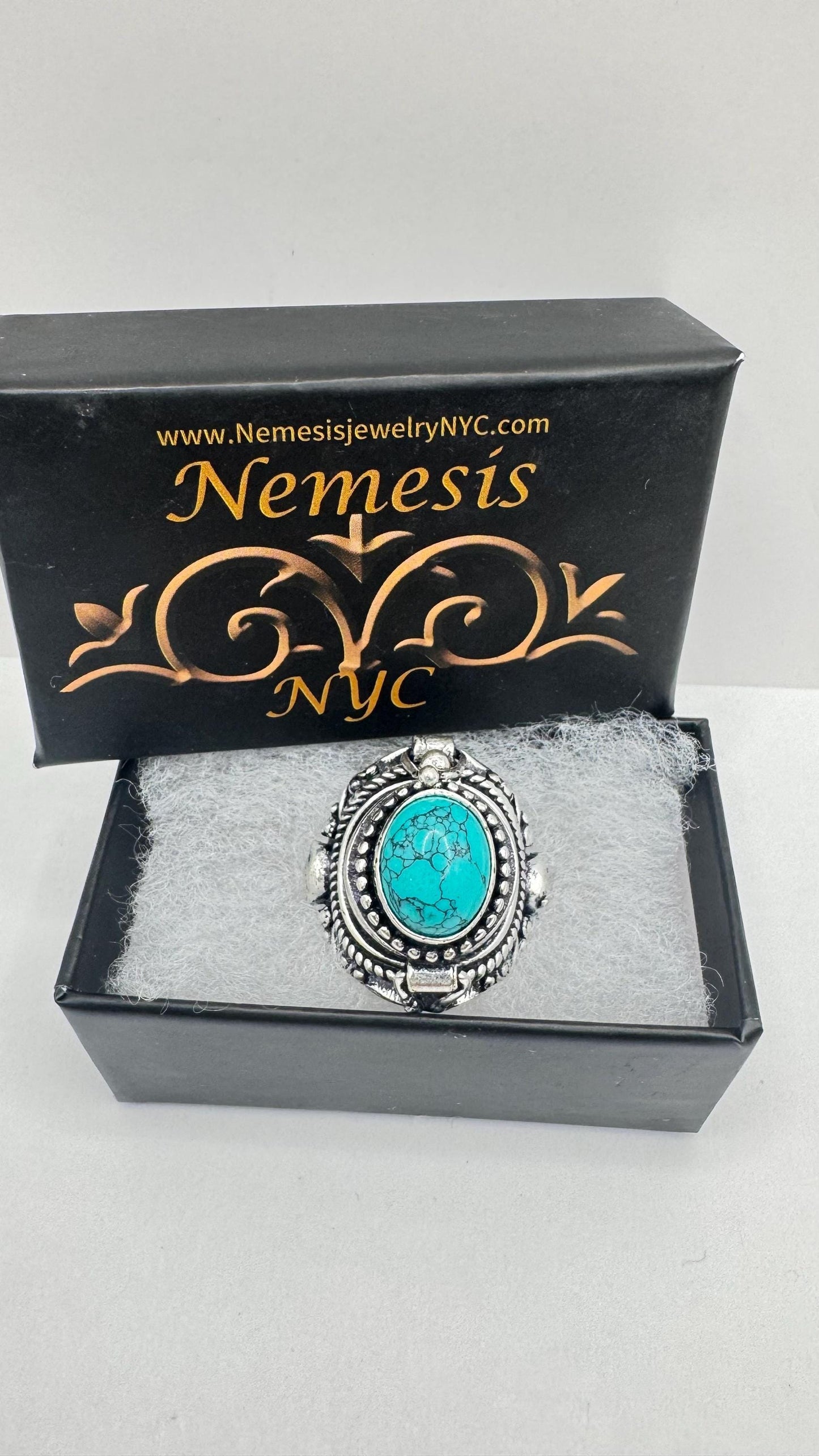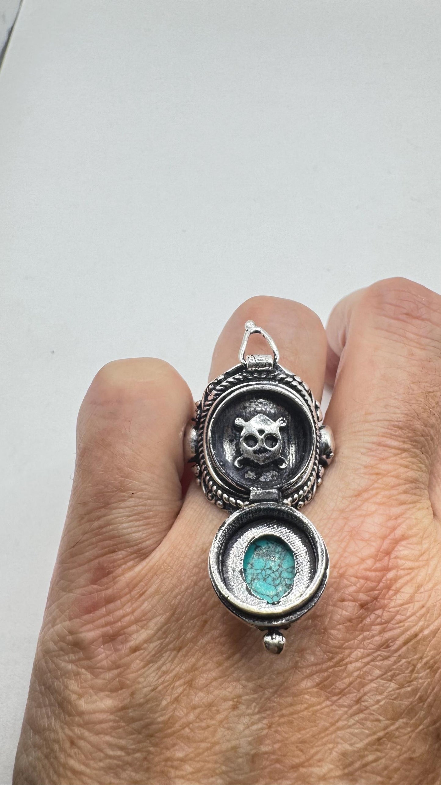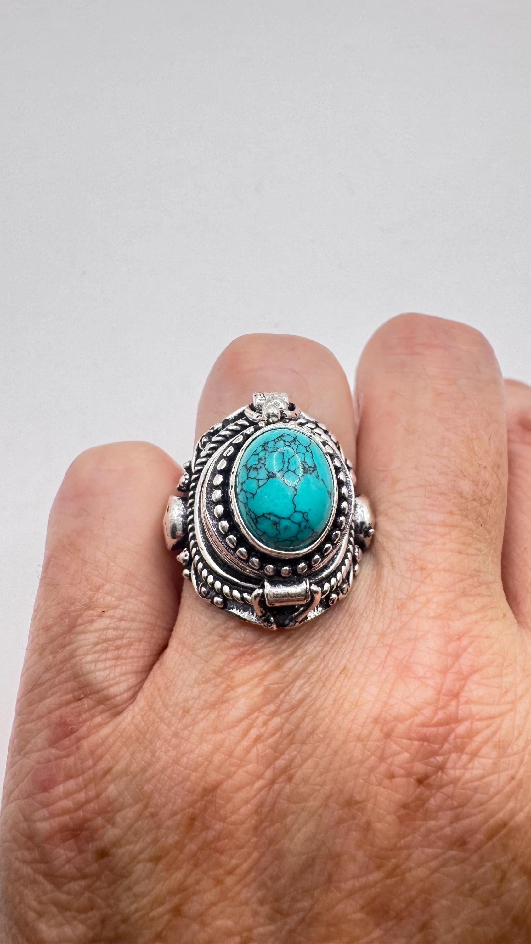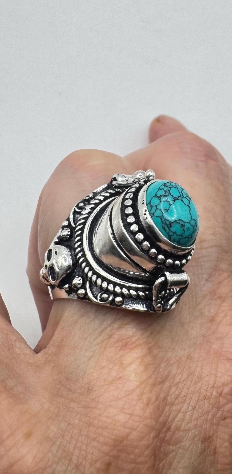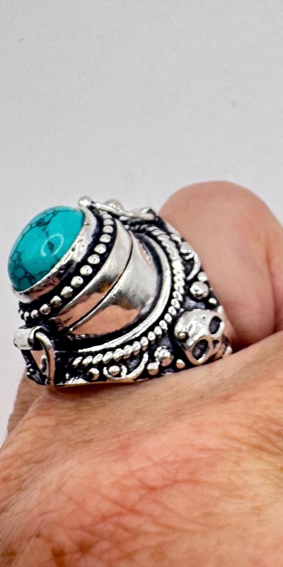Vintage Skull Blue Turquoise Howlite Silver Bronze Poison Pillbox Ring