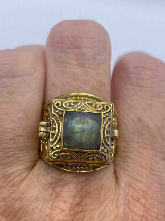 Vintage Labradorite Brass Poison Pillbox Ring