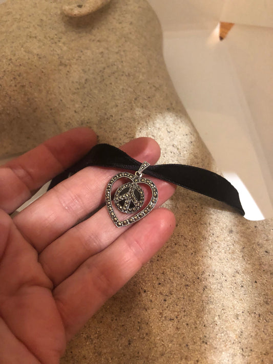 Vintage Peace Heart Sterling Silver Marcasite Black Onyx Pendant