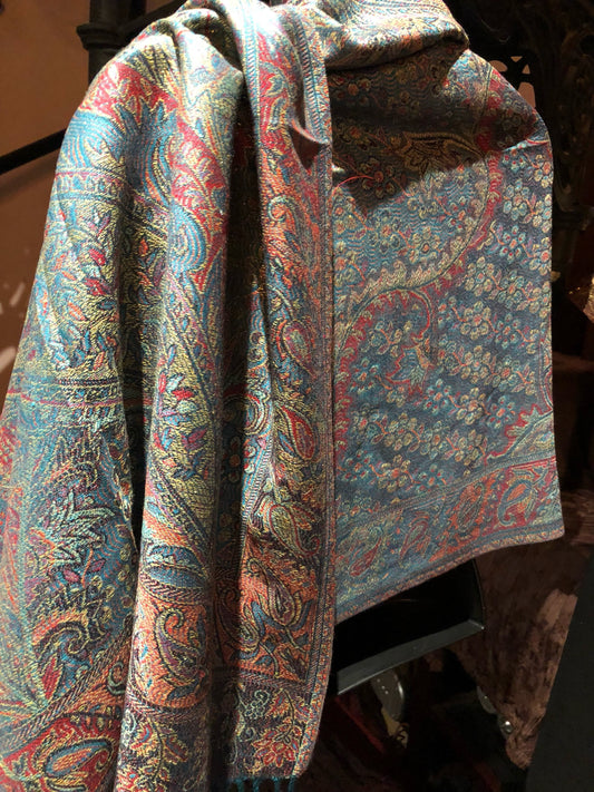Vintage Pink Turquoise Metallic Gold Paisley Brocade Pashmina Scarf Wrap