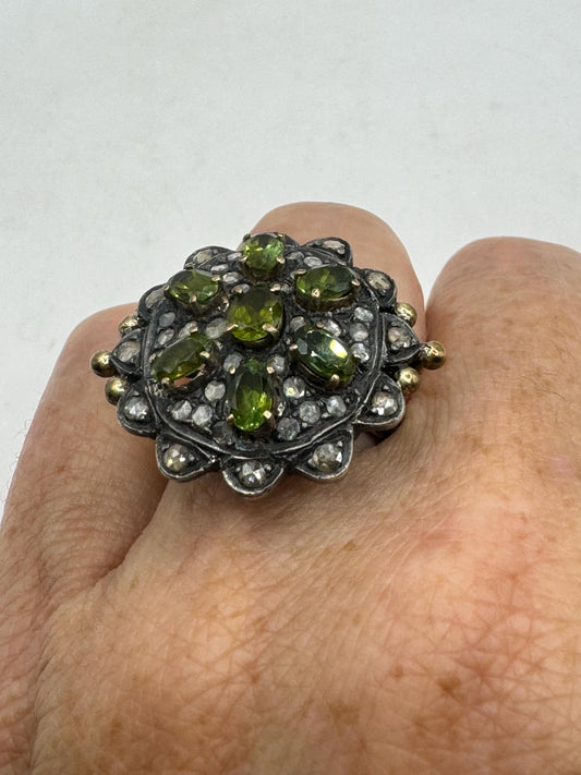 Antique Peridot Old Mine Cut Diamond Gothic 14k Yellow Gold Ring