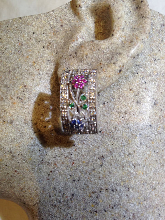 Vintage 935 Sterling Silver Genuine Blue Sapphire Rubilite and Emerald Stud Hoop button Earrings