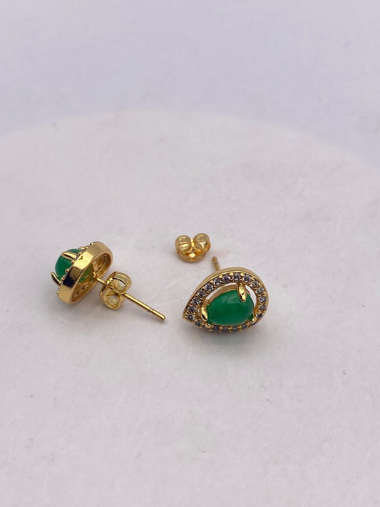 Vintage Fun Green Jade Gemstone Gold Rhodium Bronze Stud Earrings