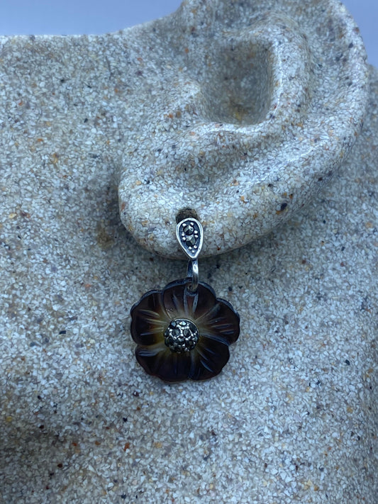 Vintage Marcasite Mother of Pearl Rose 925 Sterling Silver Dangle Earrings