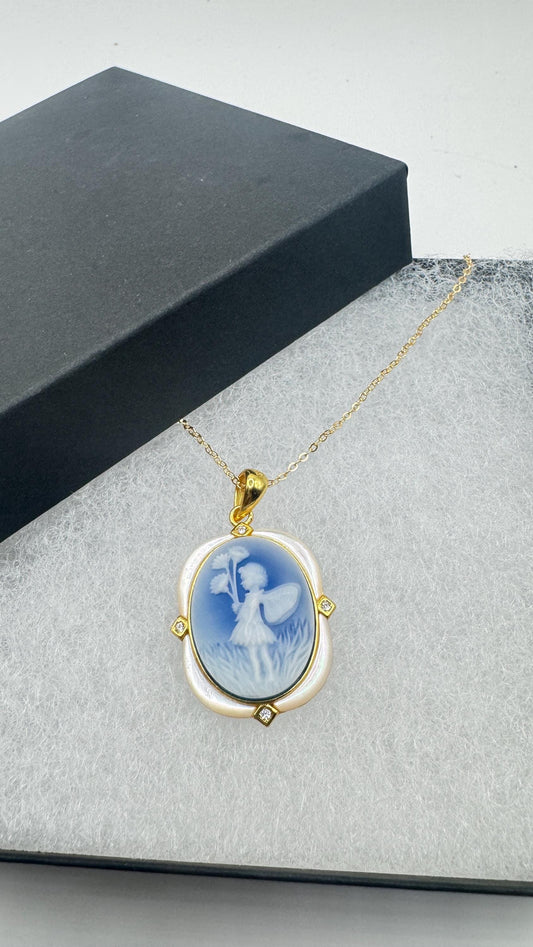 Vintage Fairy Genuine Abalone Cameo Sterling Silver Necklace