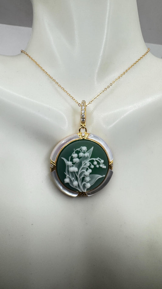 Vintage Lily of the Valley Green Onyx Cameo Choker 925 Sterling Silver Necklace