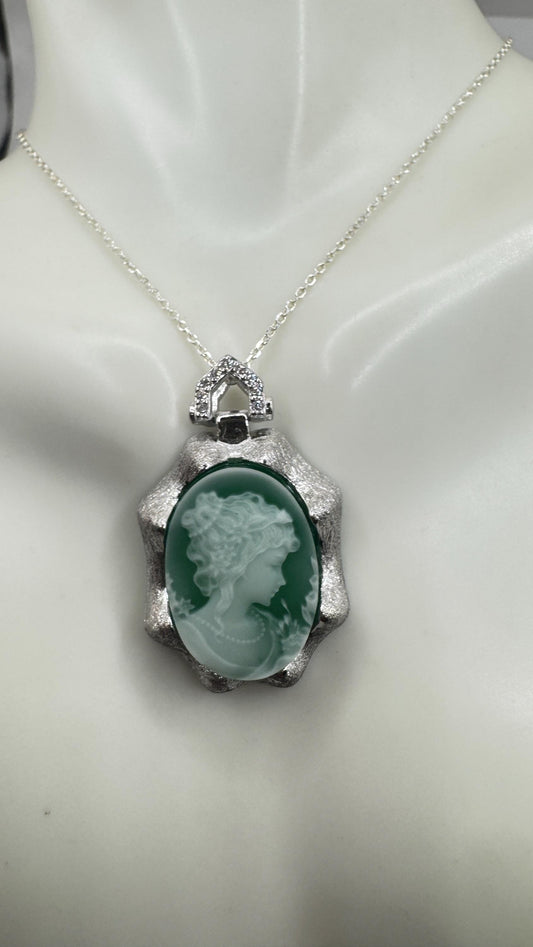 Vintage Carved Green Onyx Cameo 925 Sterling Silver Necklace Choker