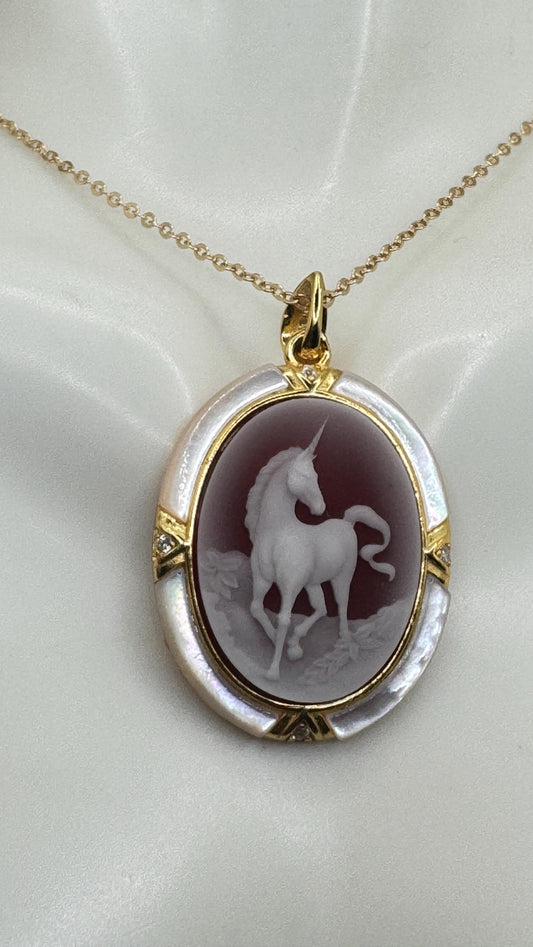 Vintage Princess with Unicorn Genuine Blue Onyx Cameo Golden Sterling Silver Necklace Choker Pin Brooch