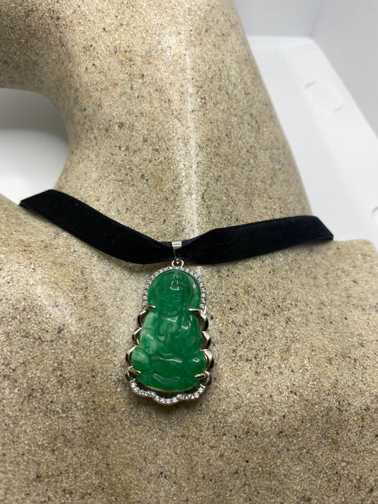 Vintage Green Jade Buddha Choker Silver Finish Necklace Pendant