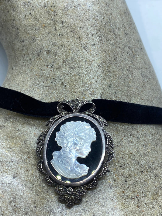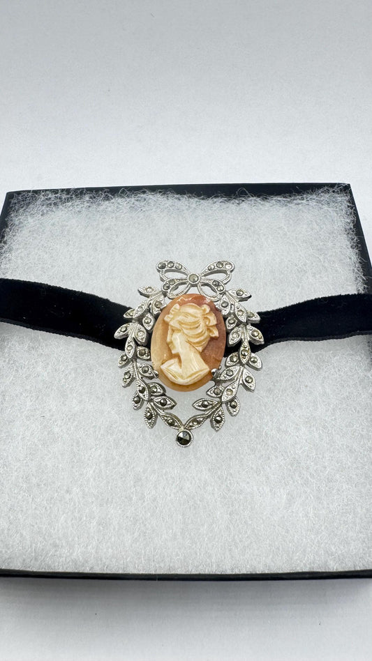 Vintage Black Cameo Marcasite 925 Sterling Silver Pin Necklace Choker