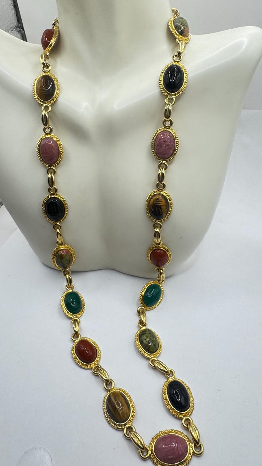 Vintage Green Jade Mixed Stone scarab Yellow Gold Fill Necklace