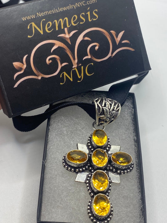 Vintage Silver Golden Citrine Cross Choker Black Velvet Necklace.