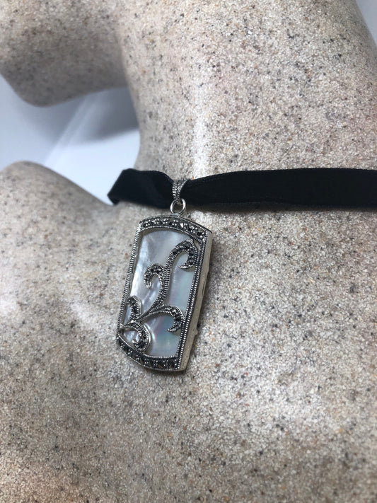 Vintage Marcasite 925 Sterling Silver Mother of Pearl Pendant Necklace