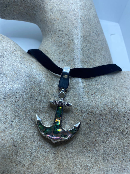 Blue Handmade Gothic Styled Silver Finished Genuine Abalone Anchor Choker Necklace