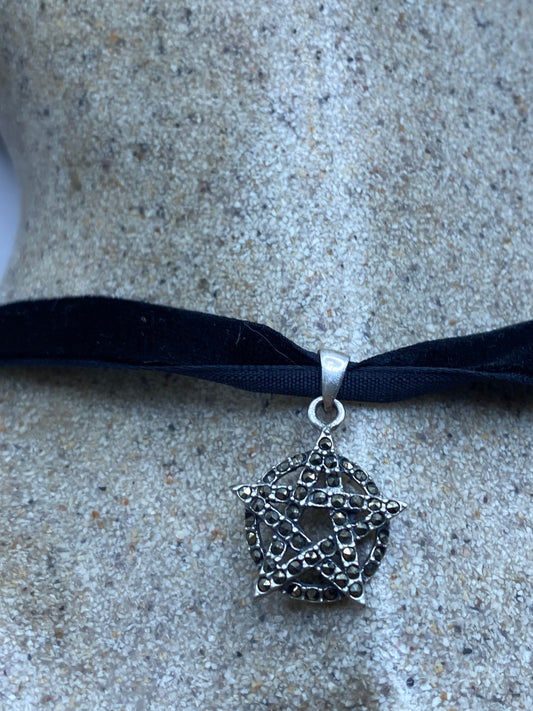 Vintage Star Choker 925 Sterling Silver Marcasite pentagle Pendant Necklace