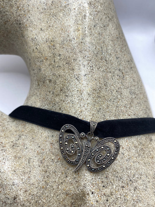 Vintage Marcasite Butterfly 925 Sterling Silver Pendant Necklace