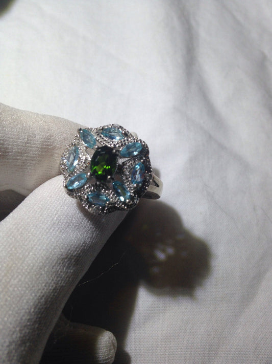 Vintage Genuine Blue Topaz Chrome Diapside 925 Sterling Silver Ring