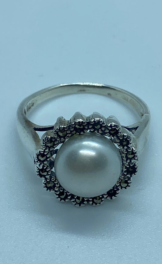 Vintage Genuine Pearl Marcasite 925 Sterling Silver Ring