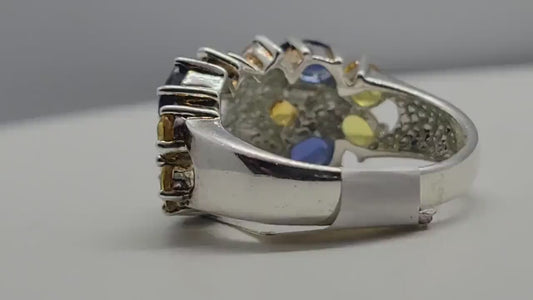 Vintage Blue and White Sapphire Yellow Citrine and Pink Tourmaline Ring in 925 Sterling Silver Flower Setting