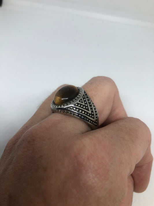 Vintage Gothic Stainless Steel Genuine Tigers Eye Mens Ring