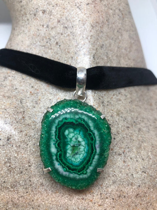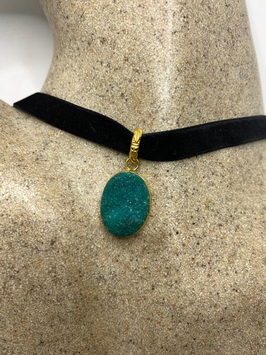 Vintage Green Chrysoprase Crystal Druzy Black Velvet Ribbon Choker Pendant