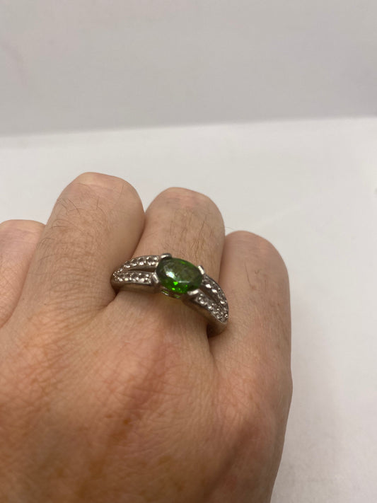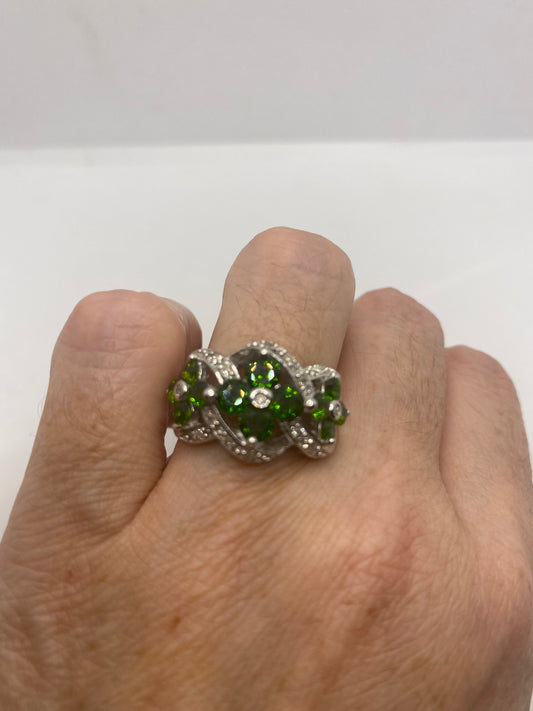 Vintage Green Crome Diopside and White Sapphire 925 Sterling Silver Cocktail Ring