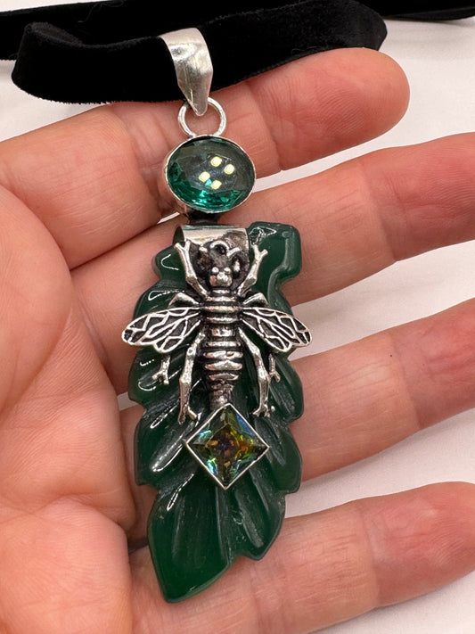 Vintage Green Chysopraise Leaf Bee Crystal Choker Pendant Black Velvet Choker