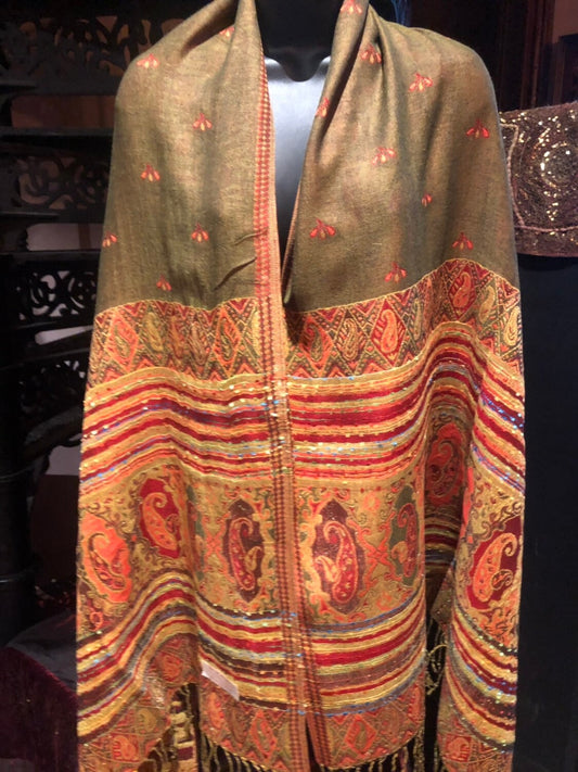 Vintage Green Metallic Gold Paisley Brocade Pashmina Scarf Wrap