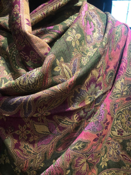Vintage Green Pink Paisley Brocade Pashmina Scarf Wrap