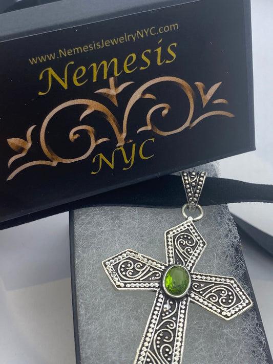 Vintage Green Peridot Silver Cross Choker Pendant Black Velvet Ribbon
