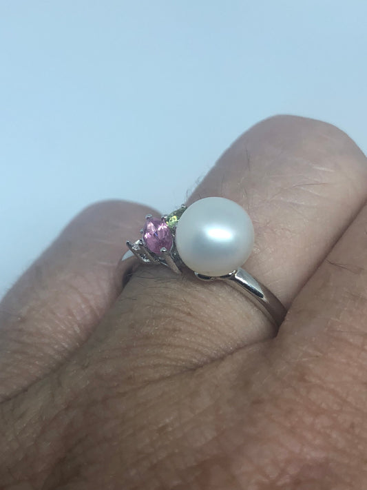 Vintage Handmade Genuine Watermelon and Cultured Pearl Tourmaline 925 Sterling Silver Ring