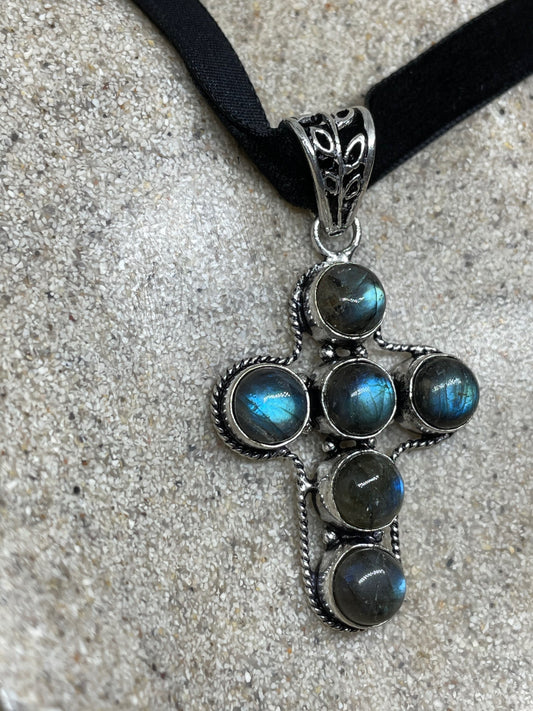 Vintage Handmade Silver Finish Rainbow Labradorite Cross Choker Pendant