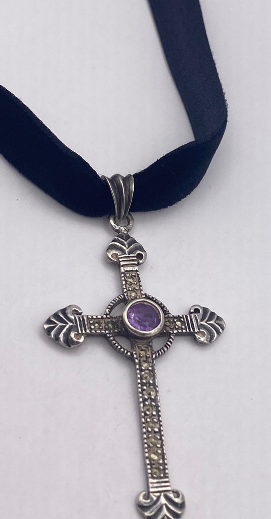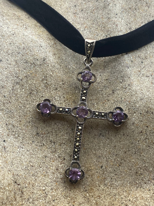 Vintage Purple Amethyst Marcasite Cross Choker Black Velvet Ribbon Pendant