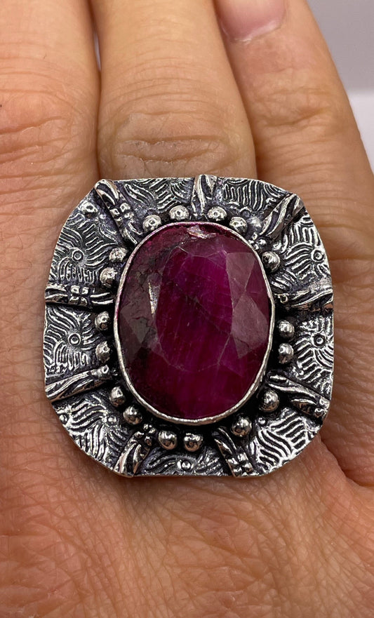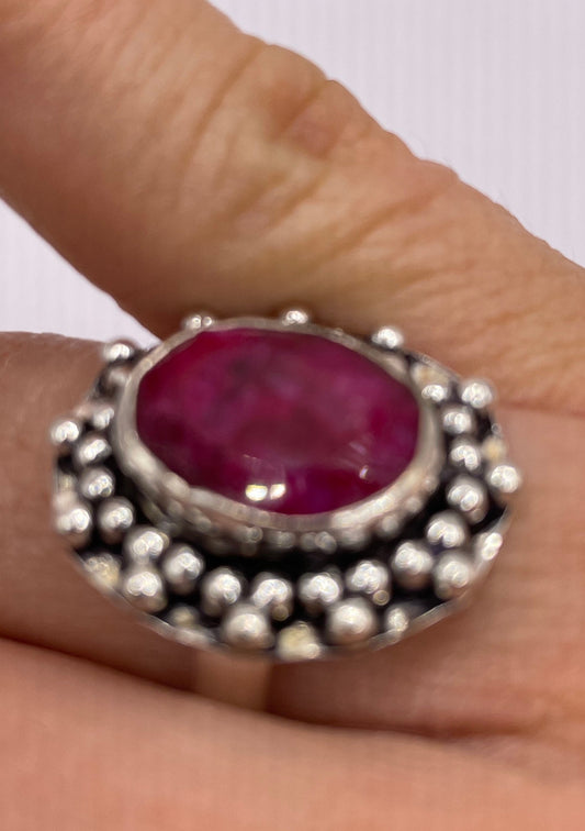 Vintage Raw Pink Ruby Silver Boho Chunky Ring
