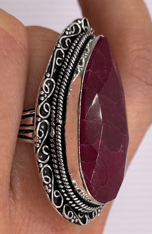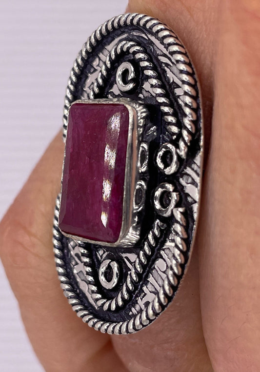 Vintage Raw Pink Ruby Silver Boho Cocktail Ring