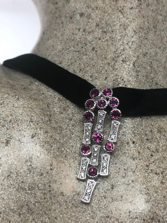 Vintage 925 Sterling Silver Genuine Red Tourmaline Antique Choker Pendant Necklace