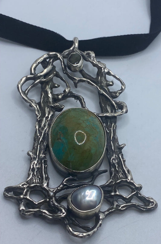 Vintage 925 Sterling Silver Green Turquoise Pearl and Sapphire Vine Pendant Choker Necklace