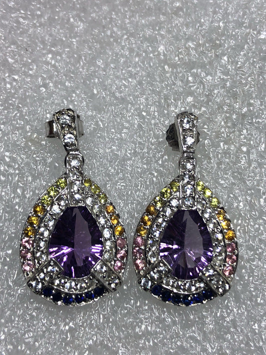 Vintage Handmade 925 Sterling Silver Purple Amethyst Deco Chandelier Earrings