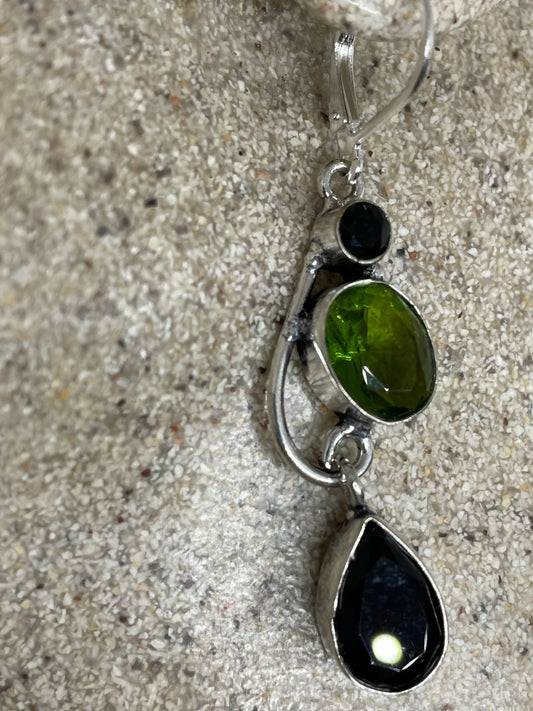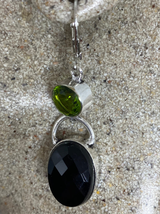 Antique Vintage Green Peridot Black Onyx Silver Dangle Earrings
