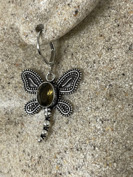 Vintage Smoky Topaz Dragonfly LeverBack Earrings 925 Sterling Silver Dangle