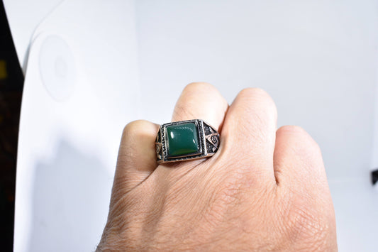 Vintage Gothic Silver Stainless Steel Genuine Green Onyx Free Mason Mens Ring