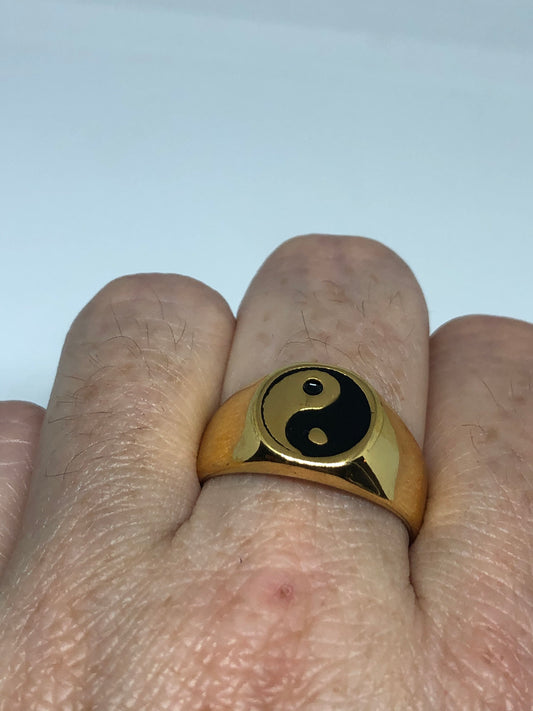 Vintage Ying Yang Mens Golden Stainless Steel Enamel Ring