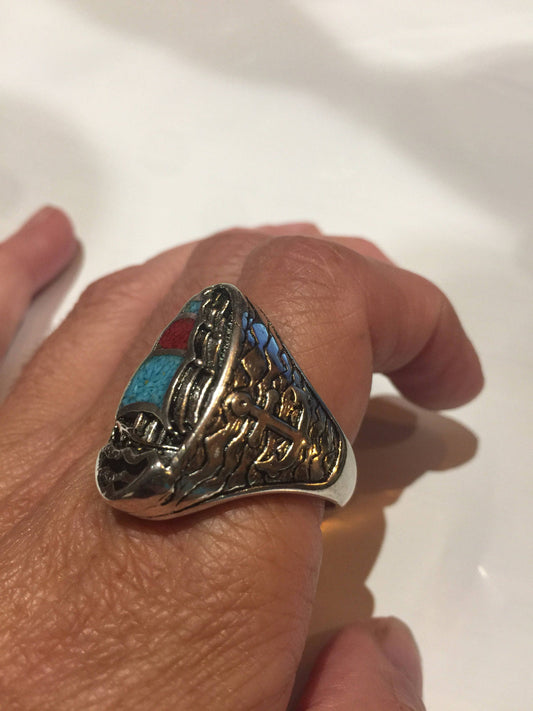 Vintage Southwestern Genuine Turquoise Inlay Sailboat Mens Ring