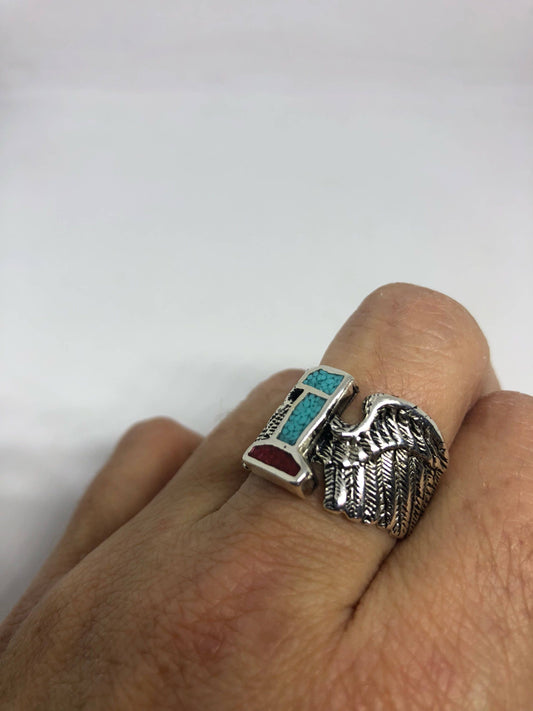 Vintage Native American Style Southwestern Turquoise Stone Inlay Mens Hawk Ring