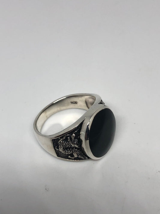Vintage Gothic Sterling Silver Genuine Black Onyx Dragon Mens Ring
