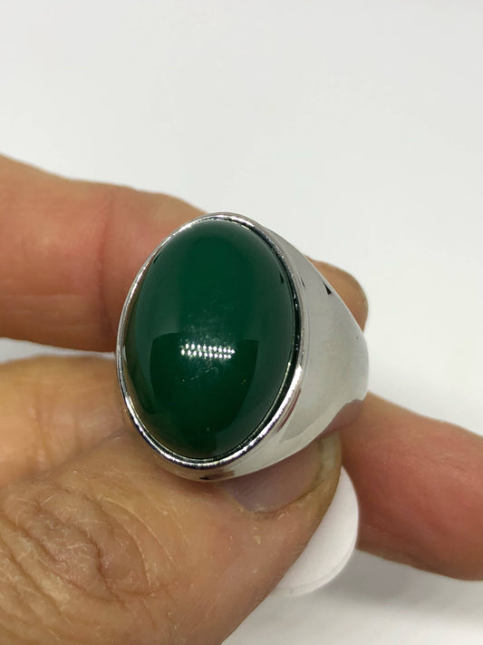 Vintage Silver Stainless Steel Genuine Green Onyx Mens Ring